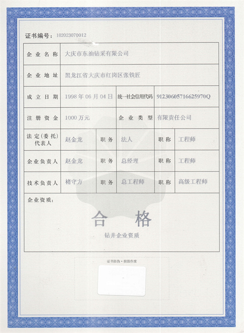 大慶東油鉆井企業(yè)資質(zhì)證書(shū)
