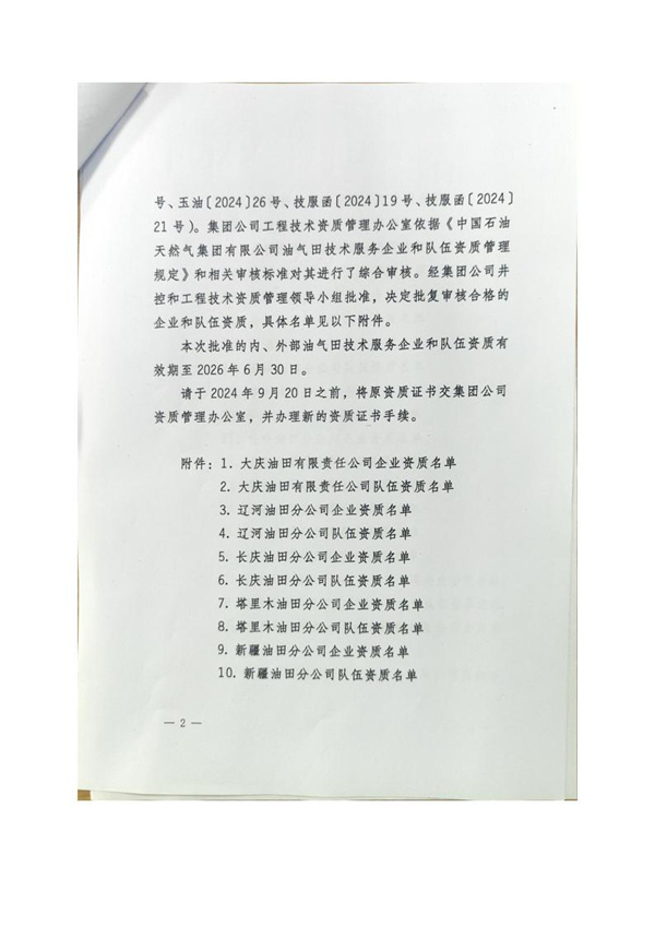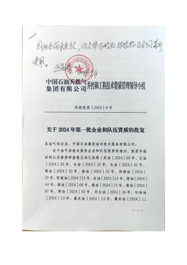 中石油“關(guān)于2024年第一批企業(yè)和隊伍資質(zhì)的批復”文件